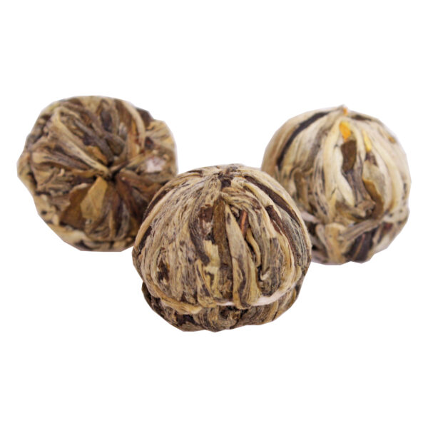 Herbata kwitnąca Eastern Fair, to doskonała, zielona herbata z tropikalną nutą.Ręcznie zwinięte, podłużne listki zielonej herbaty szczelnie zakrywają skrywany w środku skarb w postaci pięknego kwiatu aksamitki, oraz kilku mniejszych kwiatów jaśminu.W smaku wyczujemy klasyczny smak zielonej herbaty, przeplatany kwiatową nutą i wyraźne wyczuwalnym, kokosowym akcentem.Wrzuć jedną kulkę herbaty do wody o temperaturze 75-80 stopni Celsjusza, poczekaj chwilę i ciesz się widokiem pięknie rozwijających się zielonych listków oraz kolorowych kwiatów.Takie przedstawienie najlepiej oglądać w przezroczystym naczyniu o pojemności minimum 400 ml.
