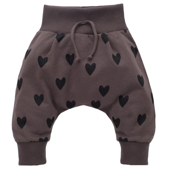 Spodnie pumpy dla dziewczynki z brązowej dresówki w nadruk uroczych serduszek, wykonany bezpieczną metodą farb wodnych. W pasie z przodu umieściliśmy ozdobne sznureczki. Od rozmiaru 74 sznureczki umożliwiają regulację szerokości w pasie. Spodnie doskonale sprawdzą się na jesienno-zimowe chłody. Swobodny krój spodni zapewni maluchowi wygodę podczas codziennych aktywności. Nieuciskający ściągacz w pasie utrzymuje ubranko w odpowiednim miejscu. Od rozmiaru 74 w pasie wszyta jest gumka, która utrzymuje pumpy na swoim miejscu w czasie raczkowania lub chodzenia. Spodnie możesz dowolnie łączyć ze wszystkim ubrankami z kolekcji Little Bird, tworząc wiele ciekawych stylizacji. Instrukcja prania: max. 40°C Skład: 100% bawełna.
