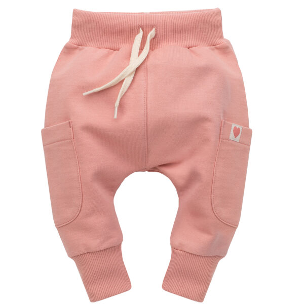 Spodnie pumpy dla dziewczynki z różowej dresówki. Duże kieszenie po bokach, sprawdza się idealnie na dziecięce skarby. W pasie z przodu umieściliśmy ozdobne sznureczki, za pomocą których można regulować ich szerokość. Na lewej kieszonce jest naszywka z różowym serduszkiem. Spodnie doskonale sprawdzą się w chłodniejsze wiosenno-letnie dni. Swobodny krój spodni zapewni maluchowi wygodę podczas zabawy, nauki chodzenia, raczkowania i innych codziennych aktywności. Nieuciskający ściągacz z gumką, wszyty w pasie, utrzymuje ubranko w odpowiednim miejscu. Spodnie możesz dowolnie łączyć ze wszystkim ubrankami z kolekcji Spring Light, tworząc wiele ciekawych zestawów. To niezbędny element wyprawki do przedszkola i żłobka. Instrukcja prania: max. 40°C Skład: 100% bawełna.