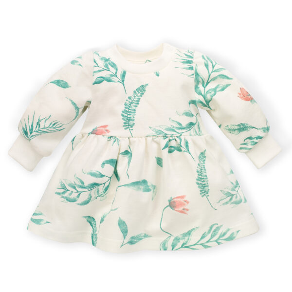 Modna dziewczęca sukienka z dresówki ecru w nadruk kwiatów i zielonych liści. Do druku wykorzystaliśmy bezpieczną metodę farb wodnych, dzięki czemu nie spiera się nawet po wielu praniach. Sukienka jest rozkloszowana od pasa w dół. Luźny fason sprawia, że nie krępuje ruchów podczas zabawy oraz innych codziennych aktywności. Sukienka zapinana jest na lewym ramieniu, co znacznie ułatwia ubieranie i rozbieranie maluszka. Zatrzaski wykonano z antyalergicznego, bezpiecznego tworzywa bez dodatku niklu. Doskonałym uzupełnieniem dla sukienki będzie kamizelka oraz opaska z kolekcji Spring Light. Sprawdzi się na co dzień oraz wyjątkowe okazje np. przyjęcia czy akademie w przedszkolu. Instrukcja prania: max. 40°C Skład: 100% bawełna.