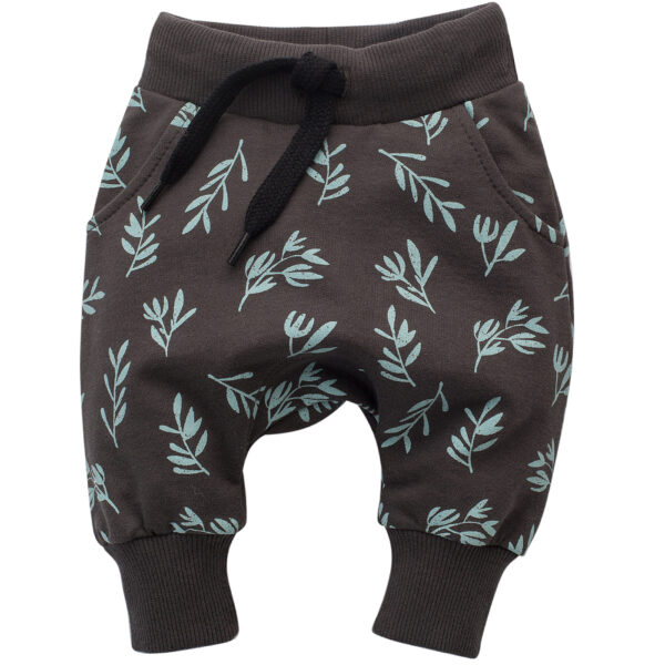 Wygodne spodnie typu pumpy z grafitowej dresówki w autorski wzór turkusowych gałązek z liśćmi. Kieszenie po bokach sprawdzą się idealnie na dziecięce skarby. Wszyty w pasie nieuciskający ściągacz z gumką, utrzymuje ubranko w odpowiednim miejscu. Specjalne sznureczki umożliwiają regulację szerokości. Pumpy doskonale sprawdzą się w chłodniejsze wiosenno-letnie dni, jak również jesienią i zimą. Swobodny krój spodni zapewni maluchowi wygodę podczas zabawy, nauki chodzenia, raczkowania oraz innych codziennych aktywności. Można je dowolnie łączyć z pozostałymi ubrankami z kolekcji Stay Green, tworząc wiele ciekawych stylizacji. To niezbędny element wyprawki do przedszkola i żłobka. Skład: 100% bawełna.