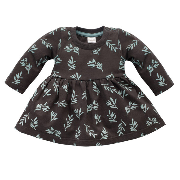 Piękna, dziewczęca sukienka z długim rękawem, we wzór turkusowych gałązek z listkami. Dzięki zastosowaniu specjalnej metody farb wodnych, nadruki nie spierają się nawet po wielu praniach. Sukienka jest rozkloszowana od pasa w dół. Ma luźny fason, więc nie krępuje dziecku ruchów podczas codziennych aktywności. Wygodne zapięcie na lewym ramieniu do rozmiaru 92, ułatwia ubieranie i rozbieranie. Zatrzaski wykonano z antyalergicznego, bezpiecznego tworzywa bez dodatku niklu. Z tyłu na wysokości karku umieściliśmy ozdobną naszywkę z napisem STAY GREEN. Sukienka sprawdzi się na co dzień lub specjalne okazje np. przyjęcie bądź akademię w przedszkolu. Stworzy piękny zestaw z chustką i opaską z tym samym wzorem.Skład: bawełna 95%, elastan 5%.