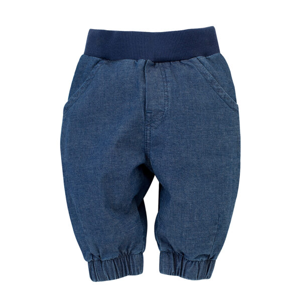 Wygodne chłopięce pumpy z miękkiego, cienkiego jeansu. Spodnie po bokach mają dwie kieszonki, do których zmieszczą się bez problemu dziecięce skarby. Z tyłu po prawej stronie, na wysokości bioder, umieściliśmy ozdobną naszywkę z samochodzikiem retro. Z przodu spodnie są ozdobione imitacją zamka. W pasie jest szeroki, nieuciskający ściągacz uzupełniony gumką, który utrzymuje ubranko w odpowiednim miejscu podczas zabawy oraz innych aktywności. Luźny krój spodni nie krępuje dziecku ruchów, zapewniając mu wygodę noszenia. Spodnie możesz łączyć z pozostałymi ubrankami z kolekcji Little Car. Doskonale sprawdzą się w garderobie przedszkolaka i dziecka uczęszczającego do żłobka.Skład: bawełna 97%, elastan 3%.