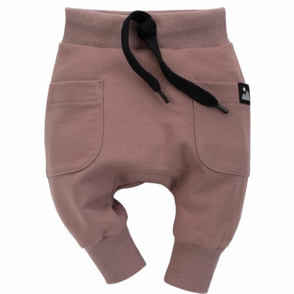Wygodne, chłopięce pumpy z ciemnobeżowej dresówki, z dwoma kieszeniami, idealnymi na dziecięce skarby. Na lewej kieszonce umieściliśmy ozdobną naszywkę z górami. W pasie jest szeroki, nieuciskający ściągacz uzupełniony gumką, który utrzymuje ubranko w odpowiednim miejscu w trakcie codziennych aktywności. Specjalnymi sznureczkami można regulować szerokość w pasie. To przydatne rozwiązanie, gdy maluszek jest drobnej budowy. Nogawki wykończone są praktycznymi ściągaczami. Luźny fason spodni nie krępuje ruchów dziecka, co zapewnia mu komfort podczas zabawy, nauki raczkowania czy chodzenia. Spodenki można dowolnie łączyć z innymi ubrankami z kolekcji Dreamer. Doskonale sprawdzą się do żłobka i przedszkola. Skład: 100% bawełna.