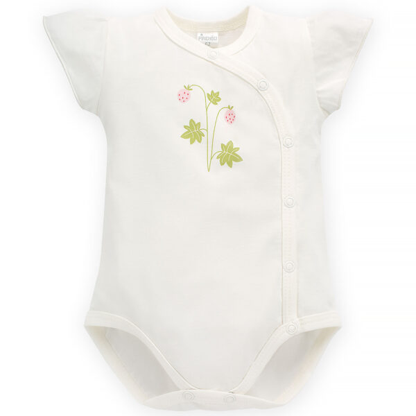 Body niemowlęce rozpinane, z krótkim rękawem, w kolekcji Summer Mood uszyte zostało z delikatnej bawełny w kolorze écru, dzięki czemu maluszek będzie czuł się w nim komfortowo i swobodnie. Kolor écru jest delikatny i świetnie sprawdzi się jako element wielu stylizacji. Umieszczony na przodzie nadruk poziomek, nawiązuje do unikatowego charakteru kolekcji. Starannie dobrana, subtelna lamówka w kolorze ubranka sprawia, że produkt wygląda pięknie i świetnie się układa. Rękawki wykończyliśmy delikatnym marszczeniem, które nadaje ubranku dziewczęcego uroku. Body niemowlęce to niezbędny element wyprawki dla noworodka. Wyprodukowane jest w Polsce oraz posiada certyfikat „Bezpieczny dla dziecka".uszyte w 100% z bawełnynadruk wykonany bezpieczną metodą farb wodnych, odpornych na codzienne użytkowanie i praniedelikatne wykończenie kroku i szyjki sprawiają, że maluch czuje się w ubranku komfortowo i jednocześnie wygląda przepiękniedla ułatwienia ubierania i przewijania, rozpinane na całej długości na wygodne, bezniklowe zatrzaskiPrać mechaniczne w temp. do 40°C. Nie stosować bielenia. Można suszyć w suszarce bębnowej. Prasować po lewej stronie w temp. do 200° C. Nie czyścić chemicznie.