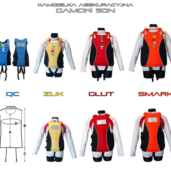 "GAMOŃ" czyli rodzina kamizelek asekuracyjnych przeznaczonych dla dzieci umiejących pływaćJest to prosty i niezwykle funkcjonalny model dziecięcego środka asekuracyjnego 50N o minimalistycznej klasycznej konstrukcji – są to cechy, które gwarantują komfort, niezawodność oraz uniwersalność produktu.Brak znaczących ograniczeń ruchowych czyni ją znakomitym partnerem dziecka podczas rekreacji nad wodą i na wodzie. Sprawdza się doskonale między innymi w kajakarstwie, play-parkach, rejsach stateczkami i przy korzystaniu z wielu innych atrakcji na wodzie i w jej sąsiedztwie bez względu na porę roku.Kamizelkę możemy zakładać ją przez głowę jak również wsuwając się bokiem po rozpięciu klamer z lewej strony. Przednie mocowania klamer wykonane jest z elastycznej taśmy. Elastyczne ściągacze na ramionach i boczne przy klamrach powodują większą plastyczność, co za tym idzie wyższy komfort używania, przy jednoczesnym zachowaniu dobrego dopasowania.Przed wysunięciem się z kamizelki w dół zabezpieczają dwa asymetrycznie ulokowane pasy krokowe. Zachowanie takiej swobodnej strefy pozytywnie wpływa na bezpieczeństwo ważnych atrybutów stanowiących o kobiecości lub męskości małych użytkowników.Długość kamizelki, głębokie wycięcia w ramionach i pod brodą zapewniają możliwie maksymalną ruchomość ciała. Kamizelka z przodu i z tyłu, dla lepszej widoczności, posiada taśmy odblaskowe spełniające wymogi konwencji SOLAS oraz wszyte odblaskowe „lamówki”.Należy pamiętać, że dodatnią pływalność dziecku, kamizelka nada wyłącznie pod warunkiem jej poprawnego założenia i noszenia. Niewygodna kamizelka jest eksploatowana niechętnie lub nie jest noszona więc nie działa i/lub może zniechęcić do korzystania z przyjemności.Środek asekuracyjny zgodny jest z normą: PN – EN ISO 12402 – 5:2007.Tabela rozmiarów: RozmiarKolor (przód i tył)Kolor (boki)ADługość w osi mostka (cm)BDługość kamizelki (cm)CDługość pasów krokowych (cm)DObwód klatki piersiowej (cm)QCNiebieskiCzarny29354045-55ŻukŻółtyCzarny32374055-70Glut PomarańczowyCzarny36404060-70SmarkCzerwonyCzarny37424070-80Maksymalny wzrost użytkownika 155 cmPamiętaj że wyżej opisany produkt nie jest środkiem ratunkowym, a dziecko bezwładne w wodzie (np. nieprzytomne) będzie unosiło się na powierzchni z twarzą poniżej lustra wody, będzie wymagało zdecydowanej natychmiastowej pomocy lub utonie.Ważne !Zawsze po zakupie wypróbuj w wodzie (np. na basenie) jak zachowuje się ciało twojego dziecka w kamizelce. Zorientuj się na co kamizelka dziecku pozwala ), niech to będzie pretekst do kolejnych bezpiecznych i fascynujących przygód w wodzie i nad wodą.Uwaga !Ilość materiału wypornościowego nie wzrasta wprost proporcjonalnie do zwiększanej masy ciała dziecka.Masa ciała, w wielu przypadkach może być mniej istotnym parametrem przy próbie poprawnego doboru środka asekuracyjnego.Pamiętaj !Inne elementy wypornościowe w ekwipunku mogą znacząco zmienić funkcjonalność kamizelki.Siadanie (zgniatanie) na kamizelce uszkadza ją i prowadzi do zmniejszenia wyporności.Dla uzyskania dobrej funkcjonalności (maksymalizacja bezpieczeństwa) kamizelka nie może posiadać uszkodzeń, musi być poprawnie dopasowana i dobrze zapięta, a przede wszystkim założona!