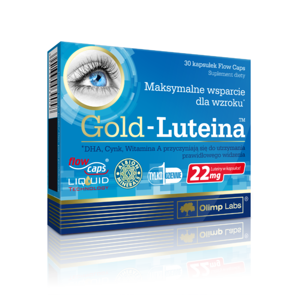 Charakterystyka: Gold-Luteina™ to suplement diety w postaci kapsułek płynnych Flow Caps, zawierający skoncentrowany olej rybi standaryzowany na zawartość kwasu dokozaheksaenowego (DHA) z grupy kwasów omega-3 oraz wysokiej jakości naturalną luteinę i zeaksantynę z aksamitki wyniosłej (Tagetes erecta L.) oraz cynk w formie innowacyjnych peletek, a także witaminy A i E.Preparat przeznaczony: dla osób dorosłych dbających o wzrok, chcących uzupełnić dietę w składniki wpływające na zachowanie prawidłowego widzenia. Preparat w szczególności polecany osobom wykonujących pracę w sztucznym świetle, pracę biurową przy komputerze, narażonym na ekspozycję intensywnego światła słonecznego, odczuwającym zmęczenie wzroku i dyskomfort powodowany łzawieniem, zaczerwienieniem oczu oraz nadwrażliwością na światło, również dla osób w średnim i starszym wieku dbających o utrzymanie wzroku w dobrej kondycji.Zalecana dzienna porcja: 1 kapsułka dziennie, w trakcie posiłku, popijając odpowiednią ilością płynu.Składniki: skoncentrowany olej rybi bogaty w DHA; składniki peletek - [substancja wypełniająca - celuloza mikrokrystaliczna; luteina i zeaksantyna z aksamitki wyniosłek (Tagetes erecta L.), diglicynian cynku (chelat aminokwasowy cynku Albion®); stabilizatory - hydroksypropylometyloceluloza, glikol polietylenowy], octan DL-alfa tokoferylu - witamina E, palmitynian retinylu - witamina A, składnik otoczki - żelatyna.Zawiera składnik pochodzący z ryb.