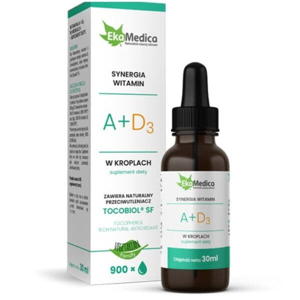 Charakterystyka(wg producenta):Preparat marki EkaMedica łączy w sobie witaminy A i D. Dzięki bogatej zawartości witamin, preparat posiada wiele właściwości aby utrzymać prawidłowe funkcjonowanie naszego organizmu. Przed wszystkim zawarta w składzie witamina A przyczynia się do zachowania zdrowia oczu i wyglądu skóry, natomiast witamina D, bierze udział za utrzymanie zdrowia naszych kości, zębów oraz mięśni. Witaminy w kroplach o unikatowym składzie zawierają wyjątkowy, w 100% naturalny przeciwutleniacz TOCOBIOL SF w postaci mieszaniny tokoferoli, który został pozyskany z oleju słonecznikowego. Z uwagi na naturalny skład produkt przyjazny dla wegetarian. Preparat zawiera 180 sugerowanych porcji............................................................................................................................................................................Właściwości:Witamina A:-pomaga w prawidłowym funkcjonowaniu układu odpornościowego,-pomaga zachować zdrową skórę,-pomaga w utrzymaniu prawidłowego widzenia,-pomaga w utrzymaniu prawidłowego stanu błon śluzowych.Witamina D:-pomaga w utrzymaniu zdrowych kości, zębów i mięśni,-pomaga w prawidłowym wchłanianiu wapnia i fosforu...............................................................................................................................................................................................Sposób użycia:Zaleca się spożywać 5 kropli produktu dziennie.Nie przekraczać zalecanej porcji do spożycia w ciągu dnia. Suplement diety nie może być stosowany jako substytut (zamiennik) zróżnicowanej diety.Kobiety w ciąży oraz w okresie karmienia przed zastosowaniem powinny skonsultować się z lekarzem................................................................................................................................................................Skład:Porcja dzienna zawiera 800 μg RE (ekwiwalentu retinolu) - 2666 IU witaminy A (100% RWS*) oraz 50 μg (2000 IU) witaminy D3 (1000% RWS*).*Referencyjna wartość spożycia dla przeciętnej osoby dorosłej (8400 kJ /2000 kcal)..................................................................................................................................................................Substancje uzupełniające:Olej słonecznikowy, olejek miętowy, przeciwutleniacz: mieszanina tokoferoli (Tocobiol® SF)................................................................................................................................................................................