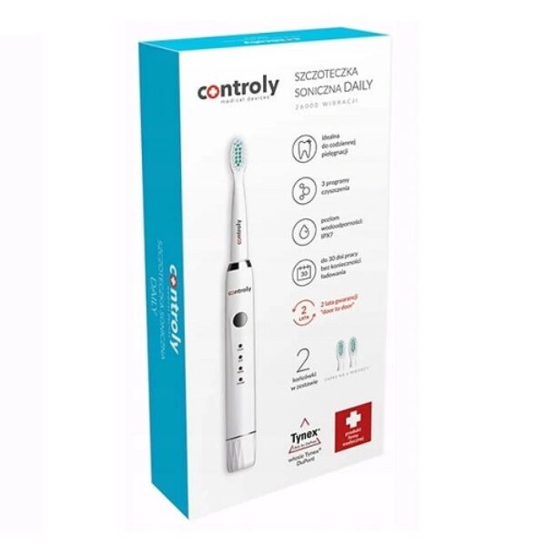 Charakterystyka(wg producenta):Soniczna szczoteczka Daily marki Controly to produkt przeznaczony do codziennej pielęgnacji higieny jamy ustnej. Dzięki technologii sonicznej, która jest połączeniem wysokiej częstotliwości drgań i szerokiego zakresu ruchu włosia szczoteczki, produkt wytwarza mikroskopijne bąbelki, które wnikają w trudne dostępne miejsca takie jak przestrzenie między zębowe czy okolice aparatów stałych. Delikatne włosie i ruchy wymiatające zmniejszają występowanie stanów zapalnych i krwawienia dziąseł. Produkt zawiera trzy tryby szczotkowania dostosowane do różnych potrzeb: clean(mycie), soft(zęby wrażliwe), white(wybielanie). Właściwości:-usuwa 10-razy więcej płytki nazębnej niż zwykła szczoteczka,-wodoodporność IPX7- szczoteczka jest w pełni wodoodporna,-trzy programy czyszczenia,-dwa lata gwarancji,-antypoślizgowa powłoka korpusu szczoteczki SoftTouch,-2-minutowy timer,-jedno ładowanie, wystarcza na miesiąc używania.Zawartość opakowania:-1 szczoteczka soniczna,-2 wymienne końcówki,-1 ładowarka indukcyjna,-1 wtyczka do gniazdka.