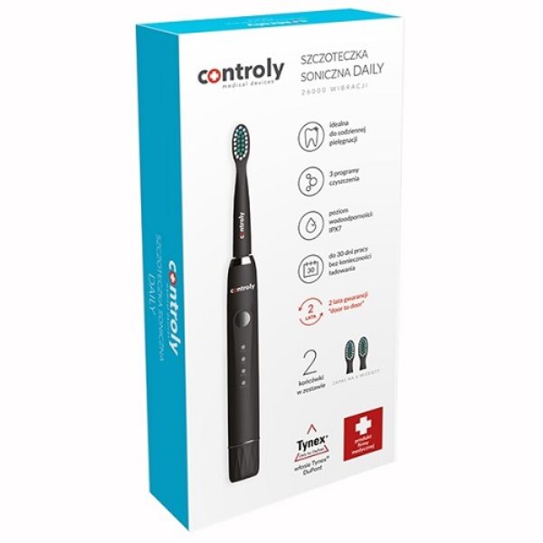 Charakterystyka(wg producenta):Soniczna szczoteczka Daily marki Controly to produkt przeznaczony do codziennej pielęgnacji higieny jamy ustnej. Dzięki technologii sonicznej, która jest połączeniem wysokiej częstotliwości drgań i szerokiego zakresu ruchu włosia szczoteczki, produkt wytwarza mikroskopijne bąbelki, które wnikają w trudne dostępne miejsca takie jak przestrzenie między zębowe czy okolice aparatów stałych. Delikatne włosie i ruchy wymiatające zmniejszają występowanie stanów zapalnych i krwawienia dziąseł. Produkt zawiera trzy tryby szczotkowania dostosowane do różnych potrzeb: clean(mycie), soft(zęby wrażliwe), white(wybielanie). Właściwości:-usuwa 10-razy więcej płytki nazębnej niż zwykła szczoteczka,-wodoodporność IPX7- szczoteczka jest w pełni wodoodporna,-trzy programy czyszczenia,-dwa lata gwarancji,-antypoślizgowa powłoka korpusu szczoteczki SoftTouch,-2-minutowy timer,-jedno ładowanie, wystarcza na miesiąc używania.Zawartość opakowania:-1 szczoteczka soniczna,-2 wymienne końcówki,-1 ładowarka indukcyjna,-1 wtyczka do gniazdka.