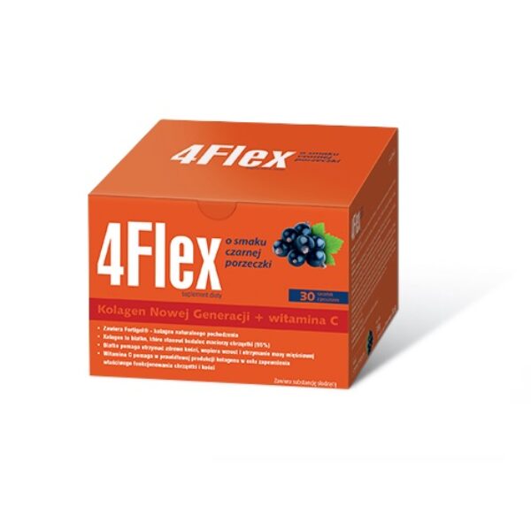 Charakterystyka(wg producenta):Suplement diety 4Flex o smaku czarnej porzeczki zawiera łatwo przyswajalny hydrolizat Kolagenu Fortigel, którym jest białko stanowiące budulec macierzy chrząstki (95%). Dodatkowo zawiera witaminę C, która bierze udział za właściwe funkcjonowanie kości. Każda saszetka to aż 10 g unikalnego hydrolizatu kolagenu – Fortigel®. Właściwości:-białko pomaga utrzymać zdrowe kości, wspiera wzrost i utrzymanie masy mięśniowej,-witamina C pomaga w prawidłowej produkcji kolagenu w celu zapewnienia prawidłowego funkcjonowania chrząstki i kości.Sposób użycia:Zawartość saszetki rozmieszać w 1 szklance niegazowanej wody, mleka lub jogurtu. Mieszać intensywnie do rozpuszczenia proszku. Spożyć bezpośrednio po przygotowaniu. Tworząca się zawiesina jest naturalną cechą produktu. Zaleca się regularne stosowanie przez dłuższy czas (minimum 3 miesiące).Nie przekraczać zalecanej porcji do spożycia w ciągu dnia.Preparat przeznaczony wyłącznie dla osób dorosłych.Kobiety w ciąży i matki karmiące piersią przed zastosowaniem powinny skonsultować się z lekarzem.Suplementy diety nie mogą być stosowane jako substytut (zamiennik) zróżnicowanej diety. Prowadzenie zdrowego trybu życia i stosowanie zrównoważonej diety są niezbędne dla zachowania dobrego stanu zdrowia.Skład:hydrolizat kolagenu Fortigel®, regulator kwasowości: kwas cytrynowy, aromat czarnej porzeczki, witamina C (kwas L-askorbinowy), barwnik: koszenila, substancja słodząca: sukraloza.