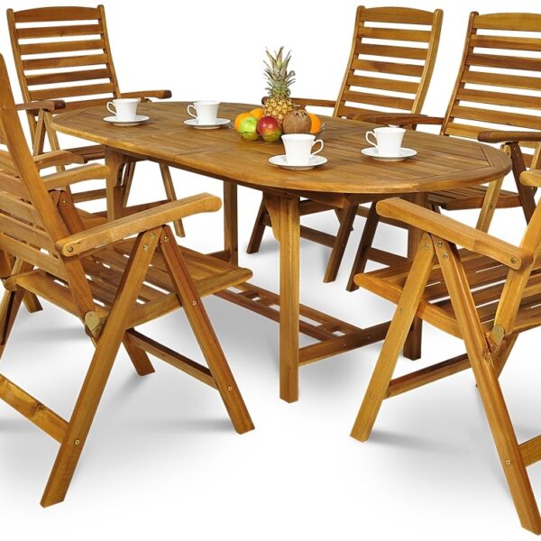 Meble AK 190SR/511 to znakomita propozycja dla osób szukających dużego i eleganckiego zestawu dla 6 osób. W celu uzyskania wysokiej trwałości i odporności na warunki atmosferyczne nasz komplet wykonany został z drewna egzotycznego Akacja, które doskonale sprawdza się w produkcji mebli ogrodowych. Całość została zaprojektowana pod kątem wygody i maksymalnej funkcjonalności, o czym świadczą składane i regulowane krzesła oraz rozkładany stół z otworem na parasol. Doskonały pomysł na ogród, działkę lub taras.