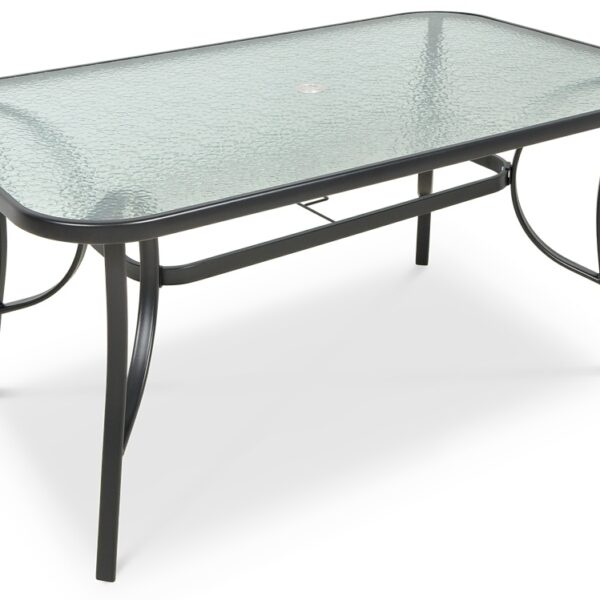 - blat stołu wykonany jest z ornamentowego, mocnego szkła hartowanego i wyposażony jest w otwór na parasol