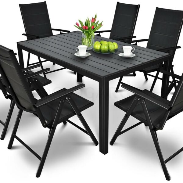 - komplet składa się z 6 pozycjonowanych krzeseł oraz dużego, prostokątnego stołu