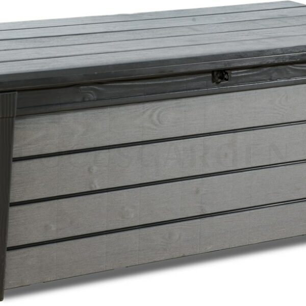 Funkcjonalna, bardzo pojemna i solidna skrzynia wykonana jest ze specjalnego tworzywa które nie tylko wygląda jak drewno, ale również przypomina je w dotyku i zapachu! Dzięki temu skrzynia sprawia wrażenie wykonanej z całkowicie naturalnych materiałów. Maksymalna odporność na warunki atmosferyczne. Doskonale sprawdzi się w ogrodzie, na tarasie lub na balkonie. Produkt renomowanej marki KETER.