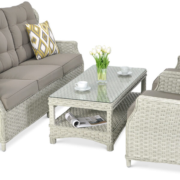 Komplet mebli ogrodowych z technorattanu, charakteryzujących się fantastyczną jakością. Zestaw wypoczynkowy Trivento 3 Melange White zawiera 2 niezwykle komfortowe fotele, równie wygodną i szeroką, 3-osobową sofę oraz praktyczny stół - wyposażony w blat z hartowanego szkła oraz dodatkową półkę na rozmaite drobiazgi, całość dopełniają stylowe, elastyczne poduchy na oparcia i siedziska. Już na pierwszy rzut oka meble ogrodowe z zestawu technorattanowego Trivento 3 przykuwają uwagę niebanalnym designem, a to tylko jeden spośród ich licznych atutów, wykonanie z najlepszych dostępnych materiałów, co w efekcie czyni z nich dobry zakup na dłuższe lata. Za żywotność oraz wytrzymałość mebli Trivento 3 Melange White odpowiadają aluminiowe stelaże i technorattanowa plecionka: wyglądająca bardzo naturalnie, a przy tym posiadająca właściwości zaawansowanych tworzyw sztucznych. Oryginalne, kolory utrzymują pierwotną intensywność pomimo wystawienia mebli ogrodowych na działanie promieni słonecznych lub opadów - i to bez chemicznej konserwacji. Zestaw Trivento 3 jest mało uciążliwy w pielęgnacji, utrzymanie foteli, sofy i stołu w perfekcyjnym stanie wymaga jedynie wycierania wilgotną ściereczką bądź usuwania zabrudzeń wodą pod ciśnieniem. Połączenie wszystkich powyższych cech sprawia, że technorattanowe meble ogrodowe nadają się zarówno do użytku zewnętrznego, jak i też do wyposażenia reprezentacyjnych pomieszczeń. Jeśli poszukujesz uniwersalnego kompletu, który posłuży Ci przez wiele kolejnych sezonów, to zestaw wypoczynkowy Trivento 3 Melange White sprawdzi się rewelacyjnie.