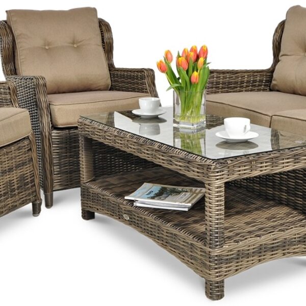 Czteroczęściowy zestaw mebli ogrodowych z technorattanu, przeznaczony zarówno do użytku zewnętrznego, jak i pasujący do domowych wnętrz. Na elegancki i praktyczny komplet Trivento składają się dwa duże, komfortowe fotele, dwuosobowa sofa oraz stolik z półeczką i blatem z hartowanego szkła. Półokrągła plecionka technorattanowa w meblach Trivento Brown prezentuje się identycznie jak w tradycyjnych wyrobach rzemieślniczych, lecz na wielu polach ma nad nimi wyraźną przewagę. Przede wszystkim w szeroko rozumianej wytrzymałości - meble technorattanowe Trivento są lekkie, elastyczne, banalnie łatwe w codziennej pielęgnacji, w zasadzie całkowicie odporne na kaprysy pogody. Kiedy inne meble ogrodowe blakną w słońcu i niszczeją na deszczu lub śniegu, zestaw Trivento Brown utrzymuje żywy, intensywny kolor oraz maksymalną użyteczność. A to wszystko dzięki wysokiej jakości technorattanowi, wyplatanemu na aluminiowym stelażu. W zestawie mebli ogrodowych Trivento najlepsze cechy konwencjonalnego rzemiosła łączą się z ulepszeniami zaawansowanych technologii. Ekologicznie, a zarazem maksimum wygody w modnym stylu. Do foteli i sofy z kompletu Trivento Brown dołączane są duże, miękkie i dopasowane kolorystycznie poduchy. Choć są i tacy, którzy uważają że takie dodatki do mebli technorattanowych wręcz odbierają przyjemność z relaksu - tworzywo tak dobrze imituje w dotyku miękki rattan. Zestaw technorattanowy Trivento wygląda świetnie, posłuży dobrze przez kilka albo i kilkanaście sezonów, a nade wszystko zapewni mnóstwo przyjemnych chwil w towarzystwie rodziny i przyjaciół.