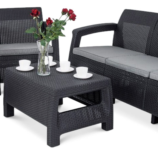 CORFU SET 3 to estetyczny i wyjątkowo atrakcyjny zestaw wypoczynkowy o fakturze imitującej rattan, w skład którego wchodzą dwa fotele, trzyosobowa kanapa i stolik. Produkt wyposażony jest w miękkie poduszki w stylowych kolorach. Meble o lekkiej, a jednocześnie stabilnej konstrukcji pięknie wpiszą się w każdą przydomową przestrzeń typu ogród, czy taras. Zestaw jest bardzo prosty w utrzymaniu czystości. Wykonany z odpornego na promienie UV i warunki atmosferyczne tworzywa.