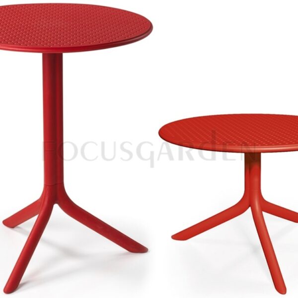 Ogrodowy stół jadalniany i mały stolik kawowy jednocześnie - wystarczy zamocować okrągły blat na wyższej (76,5 cm) bądź niższej (40 cm) ze stanowiących jeden zestaw nóg i gotowe. Jak doskonale widać na zdjęciach, Nardi Step Rosso z Włoch to nie tylko praktyczne dwa w jednym, ale i niezwykle stylowe wyposażenie. A jeśli dołożyć do tego jeszcze niezawodność i nieprzeciętną żywotność mebli, otrzyma się produkt zdecydowanie wart swojej ceny. Ze stołami Nardi Step w zanadrzu spokojnie można poważnie myśleć o organizowaniu dystyngowanych garden party, towarzyskich spotkań ze znajomymi i najbliższą rodziną… czy zmianie wystroju i klimatu w prowadzonej przez siebie restauracji. Za sprawą ażurowego wzornictwa okrągłych blatów i zgrabnych nóg na 3 stopach czerwone stoliki prezentują się nad wyraz elegancko. Ponadto stoły ogrodowe Nardi Step Rosso mają cały szereg bardzo użytecznych zalet, wynikających mniej lub bardziej bezpośrednio z nadzwyczaj starannego wykonania mebli. Mocne nogi ze specjalnym dociążeniem i antypoślizgowymi końcówkami zapewniają maksymalną stabilność, a odpowiednie i nieszkodliwe dla środowiska wykorzystanie tworzyw sztucznych - rzadko spotykaną odporność na kaprysy pogody. Dla stołu ogrodowego Nardi Step charakterystyczne jest to, że zachowuje intensywne kolory przez wiele lat, nie wymagając przy tym chemicznych środków konserwujących. Do prawidłowej pielęgnacji tych włoskich mebli wystarczy raz na jakiś czas przetrzeć je wilgotną szmatką. Krótko i konkretnie: stół Nardi Step Rosso będzie znakomitym wyborem do wyposażenia domów, jak i do restauracji oraz innego rodzaju kanałów HoReCa.