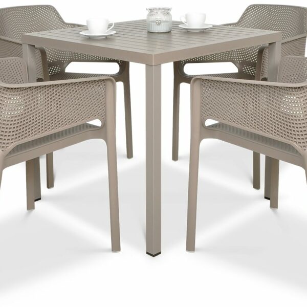 Meble ogrodowe NET/CUBE 4+1 Tortora to nowoczesny komplet jadalniany, którego autorem jest znany i ceniony producent mebli ogrodowych premium - marka Nardi. Te meble do restauracji i ogrodu zaprojektowane zostały zarówno z myślą o najbardziej wymagającym kliencie segmentu HoReCa (hotele, kawiarnie, ogródki gastronomiczne) jak i również kliencie detalicznym, który oczekuje po prostu najwyższej jakości. Mamy tu więc najlepsze materiały w postaci 100% polipropylenu wzmacnianego włóknem szklanym i aluminium, modne kolory, nowoczesny i jednocześnie uniwersalny design oraz wytrzymałość na najwyższym możliwym poziomie. Przewaga mebli ogrodowych Nardi nad innymi jest m.in. taka, że nie wymagają żadnych zabiegów konserwacyjnych, są odporne na śnieg, mróz, deszcz i słońce, generalnie mogą stać na dworze przez cały okrągły rok. Meble Nardi NET/CUBE 4+1 Tortora zapewnią miejsce czterem dorosłym osobom, które mogą zjeść posiłek lub wypić kawę przy funkcjonalnym stole jadalnianym w komfortowych warunkach. Gorąco polecamy do przydomowego ogrodu i dla wszystkich właścicieli ogródków gastronomicznych i restauracji.