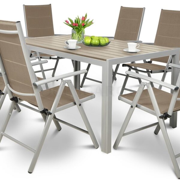 - blat stołu to wodoodporna deska kompozytowa „polywood która z jednej strony doskonale imituje naturalne drewno, a z drugiej jest całkowicie odporna na śnieg, deszcz i promieniowanie słoneczne. Nie wymaga tym samym żadnej konserwacji