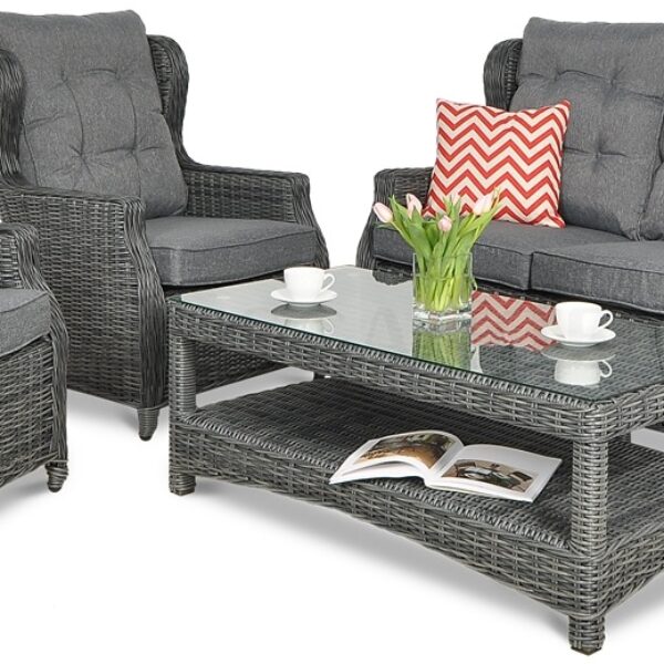 Komplet mebli ogrodowych z technorattanu, charakteryzujących się fantastyczną jakością. Zestaw wypoczynkowy Trivento 3 Dark Grey zawiera 2 niezwykle komfortowe fotele, równie wygodną i szeroką, 3-osobową sofę oraz praktyczny stół - wyposażony w blat z hartowanego szkła oraz dodatkową półkę na rozmaite drobiazgi. Całość dopełniają stylowe, elastyczne poduchy na oparcia i siedziska, zgrabnie dopasowane kolorystycznie do ciemnoszarych elementów. Już na pierwszy rzut oka meble ogrodowe z zestawu technorattanowego Trivento 3 przykuwają uwagę niebanalnym designem, a to tylko jeden spośród ich licznych atutów, wykonanie z najlepszych dostępnych materiałów, co w efekcie czyni z nich dobry zakup na dłuższe lata. Za żywotność oraz wytrzymałość mebli Trivento 3 Dark Grey odpowiadają aluminiowe stelaże i technorattanowa plecionka: wyglądająca bardzo naturalnie, a przy tym posiadająca właściwości zaawansowanych tworzyw sztucznych. Oryginalne, kolory utrzymują pierwotną intensywność pomimo wystawienia mebli ogrodowych na działanie promieni słonecznych lub opadów - i to bez chemicznej konserwacji. Zestaw Trivento 3 jest mało uciążliwy w pielęgnacji, utrzymanie foteli, sofy i stołu w perfekcyjnym stanie wymaga jedynie wycierania wilgotną ściereczką bądź usuwania zabrudzeń wodą pod ciśnieniem. Połączenie wszystkich powyższych cech sprawia, że technorattanowe meble ogrodowe nadają się zarówno do użytku zewnętrznego, jak i też do wyposażenia reprezentacyjnych pomieszczeń. Jeśli poszukujesz uniwersalnego kompletu, który posłuży Ci przez wiele kolejnych sezonów, to zestaw wypoczynkowy Trivento 3 Dark Grey sprawdzi się rewelacyjnie.