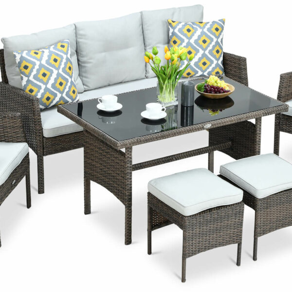- w skład zestawu wchodzi: funkcjonalna 3-osobowa sofa, 2 fotele z poduchami, 2 pufy oraz duży, prostokątny stół