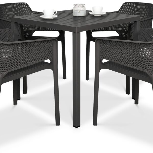 Meble ogrodowe NET/CUBE 4+1 Antracite to nowoczesny komplet jadalniany, którego autorem jest znany i ceniony producent mebli ogrodowych premium - marka Nardi. Te meble do restauracji i ogrodu zaprojektowane zostały zarówno z myślą o najbardziej wymagającym kliencie segmentu HoReCa (hotele, kawiarnie, ogródki gastronomiczne) jak i również kliencie detalicznym, który oczekuje po prostu najwyższej jakości. Mamy tu więc najlepsze materiały w postaci 100% polipropylenu wzmacnianego włóknem szklanym i aluminium, modne kolory, nowoczesny i jednocześnie uniwersalny design oraz wytrzymałość na najwyższym możliwym poziomie. Przewaga mebli ogrodowych Nardi nad innymi jest m.in. taka, że nie wymagają żadnych zabiegów konserwacyjnych, są odporne na śnieg, mróz, deszcz i słońce, generalnie mogą stać na dworze przez cały okrągły rok. Meble Nardi NET/CUBE 4+1 Antracite zapewnią miejsce czterem dorosłym osobom, które mogą zjeść posiłek lub wypić kawę przy funkcjonalnym stole jadalnianym w komfortowych warunkach. Gorąco polecamy do przydomowego ogrodu i dla wszystkich właścicieli ogródków gastronomicznych i restauracji.