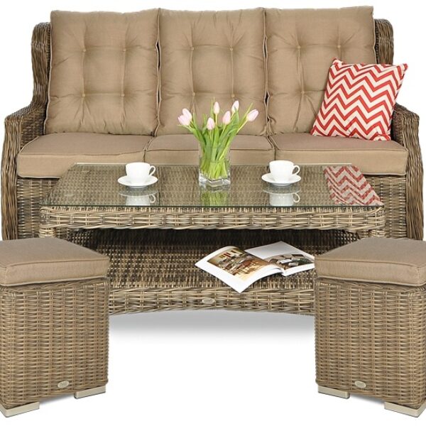 Nowoczesny i elegancki zestaw wypoczynkowy wykonany z wysokiej jakości technorattanu. Komplet składa się z dużych i wygodnych foteli, trzyosobowej sofy, dwóch puf oraz stolika kawowego. Maksymalny komfort wypoczynku zapewniają grube i odporne na odkształcenia poduchy. Przyciągający oko wygląd oraz niepowtarzalny kolor będą ozdobą Państwa ogrodu lub mieszkania. Wysoka trwałość i odporność na warunki atmosferyczne sprawią, że nasz zestaw posłuży przez długie lata.