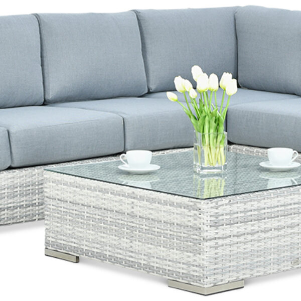 Narożnik technorattanowy Avocado White Grey warto pokazywać wszystkim, którzy nie wierzą że oryginalny styl można dobrze pogodzić z walorami użytkowymi. Na zestaw technorattanowy Avocado składają się duży narożnik z czterech modułów oraz stolik z blatem z hartowanego szkła. Te meble ogrodowe łączą w sobie wszystko, co najlepsze z designu i rozwiązań praktycznych. Już na pierwszy rzut oka narożnik Avocado wyróżnia się niebanalnym wyglądem. Prosta, nowoczesna forma, szerokie podłokietniki i biało-szary kolor świetnie pasują do każdego typu ogrodu… bądź wnętrza. Narożnik technorattanowy Avocado równie dobrze sprawdza się jako wyposażenie domu. W tym momencie trzeba wspomnieć o niezwykłych właściwościach technorattanu, wyplatanemu na aluminiowym stelażu. Tworzywo, z którego powstaje narożnik Avocado, wizualnie przypomina plecionkę z naturalnych materiałów. Jednak ma nieporównywalnie wyższą odporność na promienie UV, opady i inne zewnętrzne czynniki. Dzięki temu narożnik technorattanowy Avocado White Grey przez wiele lat nie straci na swoich licznych walorach. Do kompletu dołączane są również bardzo grube, miękkie i dopasowane kolorystycznie poduchy. W ten sposób narożnik Avocado White Grey stanowi wymarzony komplet mebli na każdą towarzyską okazję.