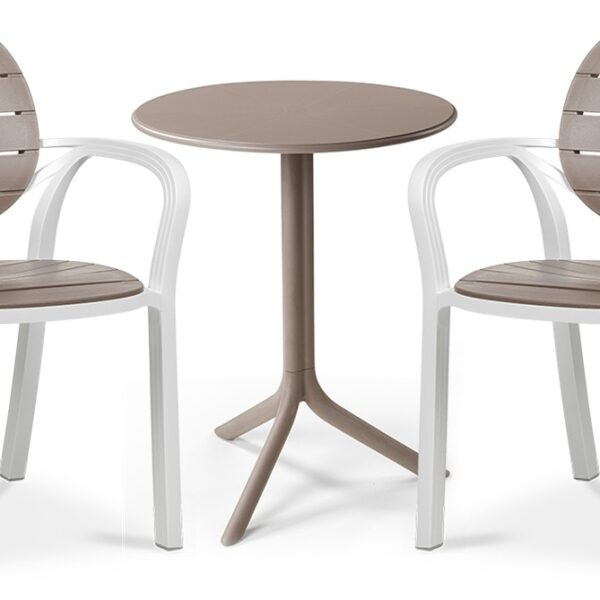 Meble ogrodowe PALMA/SPRITZ 2+1 Bianco Tortora są propozycją uznanej włoskiej marki Nardi na nowoczesne, kompaktowe zestawy restauracyjne, które świetnie nadają się na wyposażenie balkonów, tarasów, a także letnich kafejek, lodziarni, kawiarni i wszystkich innych kulinarnych przystanków. Słowem, te meble Nardi są dla każdego entuzjasty włoskiego design, przepięknej, różnorodnej kolorystyki i ultra wytrzymałości. Nie można nie wspomnieć o materiale z którego zostały wykonane – żywica syntetyczna, a dokładniej polipropylen uzupełniony dodatkowo włóknem szklanym. Taka kombinacja może oznaczać tylko jedno – niezrównaną wytrzymałość na niekorzystne warunki atmosferyczne, różnice temperatur i promieniowanie UV. Po prostu stawiamy je na zewnątrz i zapominamy o jakiejkolwiek potrzebie impregnacji, chowania do środka na niepogodę itd., wystarczy je tylko przetrzeć od czasu do czasu nawilżoną ściereczką i to wszystko. Zresztą gdyby nie była tak dobre, meble do kawiarni Nardi nie otrzymałyby prestiżowego certyfikatu Catas, który bada je właśnie pod kątem wytrzymałości na intensywne użytkowanie. To dlatego te meble na balkon Nardi są tak często wybierane zarówno przez klientów detalicznych jak i właścicieli oraz menedżerów dużych hoteli, ośrodków wypoczynkowych i restauracji. Krzesła są oczywiście sztaplowane, a stolik można w łatwy i szybki sposób złożyć, stąd meble nie potrzebują dużo miejsca gdy chcemy je przechować np. w okresie poza sezonem. Stolik Nardi Spritz to jedyny tego typu produkt na rynku, który standardowo wyposażony jest w dwie nogi o różnej długości. Dzięki nim, w zależności od potrzeby stolik może funkcjonować jako standardowy stolik jadalniany lub też przeobrazić się w niski stolik kawowy. Rewelacyjna funkcjonalność!