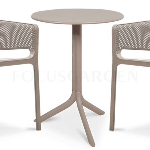Meble ogrodowe NET/SPRITZ 2+1 Tortora są propozycją uznanej włoskiej marki Nardi na nowoczesne, kompaktowe zestawy restauracyjne, które świetnie nadają się na wyposażenie balkonów, tarasów, a także letnich kafejek, lodziarni, kawiarni i wszystkich innych kulinarnych przystanków. Słowem, te meble Nardi są dla każdego entuzjasty włoskiego design, przepięknej, różnorodnej kolorystyki i ultra wytrzymałości. Nie można nie wspomnieć o materiale z którego zostały wykonane – żywica syntetyczna, a dokładniej polipropylen uzupełniony dodatkowo włóknem szklanym. Taka kombinacja może oznaczać tylko jedno – niezrównaną wytrzymałość na niekorzystne warunki atmosferyczne, różnice temperatur i promieniowanie UV. Po prostu stawiamy je na zewnątrz i zapominamy o jakiejkolwiek potrzebie impregnacji, chowania do środka na niepogodę itd., wystarczy je tylko przetrzeć od czasu do czasu nawilżoną ściereczką i to wszystko. Zresztą gdyby nie była tak dobre, meble do kawiarni Nardi nie otrzymałyby prestiżowego certyfikatu Catas, który bada je właśnie pod kątem wytrzymałości na intensywne użytkowanie. To dlatego te meble na balkon Nardi są tak często wybierane zarówno przez klientów detalicznych jak i właścicieli oraz menedżerów dużych hoteli, ośrodków wypoczynkowych i restauracji. Krzesła są oczywiście sztaplowane, a stolik można w łatwy i szybki sposób złożyć, stąd meble nie potrzebują dużo miejsca gdy chcemy je przechować np. w okresie poza sezonem. Stolik Nardi Spritz to jedyny tego typu produkt na rynku, który standardowo wyposażony jest w dwie nogi o różnej długości. Dzięki nim, w zależności od potrzeby stolik może funkcjonować jako standardowy stolik jadalniany lub też przeobrazić się w niski stolik kawowy. Rewelacyjna funkcjonalność!