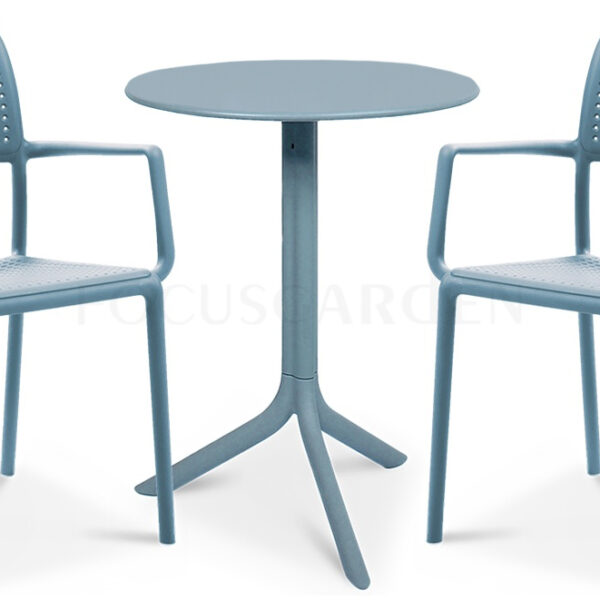 Meble ogrodowe BORA/SPRITZ 2+1 Celeste są propozycją uznanej włoskiej marki Nardi na nowoczesne, kompaktowe zestawy restauracyjne, które świetnie nadają się na wyposażenie balkonów, tarasów, a także letnich kafejek, lodziarni, kawiarni i wszystkich innych kulinarnych przystanków. Słowem, te meble Nardi są dla każdego entuzjasty włoskiego design, przepięknej, różnorodnej kolorystyki i ultra wytrzymałości. Nie można nie wspomnieć o materiale z którego zostały wykonane – żywica syntetyczna, a dokładniej polipropylen uzupełniony dodatkowo włóknem szklanym. Taka kombinacja może oznaczać tylko jedno – niezrównaną wytrzymałość na niekorzystne warunki atmosferyczne, różnice temperatur i promieniowanie UV. Po prostu stawiamy je na zewnątrz i zapominamy o jakiejkolwiek potrzebie impregnacji, chowania do środka na niepogodę itd., wystarczy je tylko przetrzeć od czasu do czasu nawilżoną ściereczką i to wszystko. Zresztą gdyby nie była tak dobre, meble do kawiarni Nardi nie otrzymałyby prestiżowego certyfikatu Catas, który bada je właśnie pod kątem wytrzymałości na intensywne użytkowanie. To dlatego te meble na balkon Nardi są tak często wybierane zarówno przez klientów detalicznych jak i właścicieli oraz menedżerów dużych hoteli, ośrodków wypoczynkowych i restauracji. Krzesła są oczywiście sztaplowane, a stolik można w łatwy i szybki sposób złożyć, stąd meble nie potrzebują dużo miejsca gdy chcemy je przechować np. w okresie poza sezonem. Stolik Nardi Spritz to jedyny tego typu produkt na rynku, który standardowo wyposażony jest w dwie nogi o różnej długości. Dzięki nim, w zależności od potrzeby stolik może funkcjonować jako standardowy stolik jadalniany lub też przeobrazić się w niski stolik kawowy. Rewelacyjna funkcjonalność!