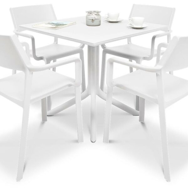 Meble ogrodowe TRILL/CLIP 4+1 Bianco to nowoczesny komplet jadalniany, którego autorem jest znany i ceniony producent mebli ogrodowych premium - marka Nardi. Te meble do restauracji i ogrodu zaprojektowane zostały zarówno z myślą o najbardziej wymagającym kliencie segmentu HoReCa (hotele, kawiarnie, ogródki gastronomiczne) jak i również kliencie detalicznym, który oczekuje po prostu najwyższej jakości. Mamy tu więc najlepsze materiały w postaci 100% polipropylenu wzmacnianego włóknem szklanym, modne kolory, nowoczesny i jednocześnie uniwersalny design oraz wytrzymałość na najwyższym możliwym poziomie. Przewaga mebli ogrodowych z tworzywa nad innymi jest m.in. taka, że nie wymagają żadnych zabiegów konserwacyjnych, są odporne na śnieg, mróz, deszcz i słońce, generalnie mogą stać na dworze przez cały okrągły rok. Meble Nardi TRILL/CLIP 4+1 Bianco zapewnią miejsce czterem dorosłym osobom, które mogą zjeść posiłek lub wypić kawę przy funkcjonalnym stole jadalnianym w komfortowych warunkach. Gorąco polecamy do przydomowego ogrodu i dla wszystkich właścicieli ogródków gastronomicznych i restauracji.