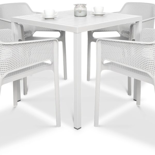 Meble ogrodowe NET/CUBE 4+1 Bianco to nowoczesny komplet jadalniany, którego autorem jest znany i ceniony producent mebli ogrodowych premium - marka Nardi. Te meble do restauracji i ogrodu zaprojektowane zostały zarówno z myślą o najbardziej wymagającym kliencie segmentu HoReCa (hotele, kawiarnie, ogródki gastronomiczne) jak i również kliencie detalicznym, który oczekuje po prostu najwyższej jakości. Mamy tu więc najlepsze materiały w postaci 100% polipropylenu wzmacnianego włóknem szklanym i aluminium, modne kolory, nowoczesny i jednocześnie uniwersalny design oraz wytrzymałość na najwyższym możliwym poziomie. Przewaga mebli ogrodowych Nardi nad innymi jest m.in. taka, że nie wymagają żadnych zabiegów konserwacyjnych, są odporne na śnieg, mróz, deszcz i słońce, generalnie mogą stać na dworze przez cały okrągły rok. Meble Nardi NET/CUBE 4+1 Bianco zapewnią miejsce czterem dorosłym osobom, które mogą zjeść posiłek lub wypić kawę przy funkcjonalnym stole jadalnianym w komfortowych warunkach. Gorąco polecamy do przydomowego ogrodu i dla wszystkich właścicieli ogródków gastronomicznych i restauracji.