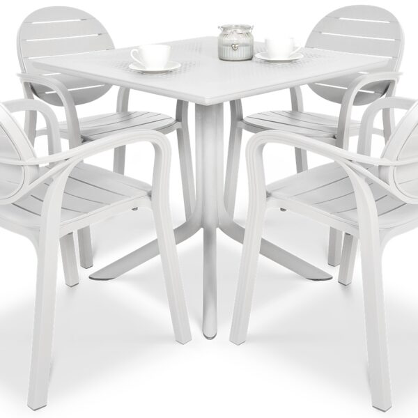 Meble ogrodowe PALMA/CLIP 4+1 Bianco to nowoczesny komplet jadalniany, którego autorem jest znany i ceniony producent mebli ogrodowych premium - marka Nardi. Te meble do restauracji i ogrodu zaprojektowane zostały zarówno z myślą o najbardziej wymagającym kliencie segmentu HoReCa (hotele, kawiarnie, ogródki gastronomiczne) jak i również kliencie detalicznym, który oczekuje po prostu najwyższej jakości. Mamy tu więc najlepsze materiały w postaci 100% polipropylenu wzmacnianego włóknem szklanym, modne kolory, nowoczesny i jednocześnie uniwersalny design oraz wytrzymałość na najwyższym możliwym poziomie. Przewaga mebli ogrodowych z tworzywa nad innymi jest m.in. taka, że nie wymagają żadnych zabiegów konserwacyjnych, są odporne na śnieg, mróz, deszcz i słońce, generalnie mogą stać na dworze przez cały okrągły rok. Meble Nardi PALMA/CLIP 4+1 Bianco zapewnią miejsce czterem dorosłym osobom, które mogą zjeść posiłek lub wypić kawę przy funkcjonalnym stole jadalnianym w komfortowych warunkach. Gorąco polecamy do przydomowego ogrodu i dla wszystkich właścicieli ogródków gastronomicznych i restauracji.