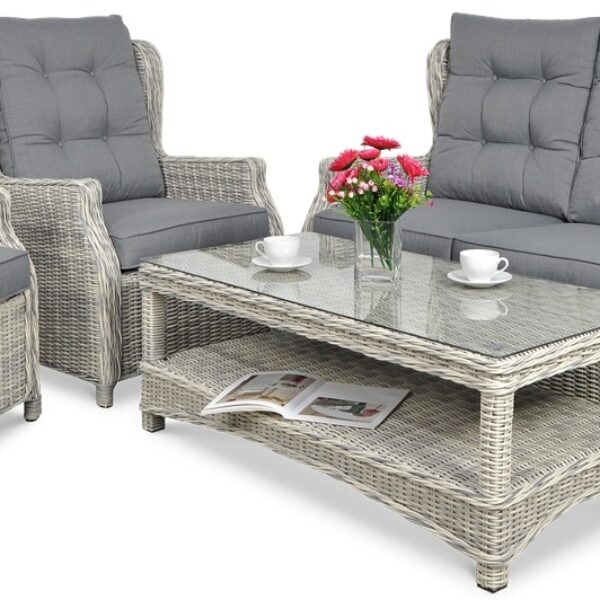 Komplet mebli ogrodowych z technorattanu, charakteryzujących się fantastyczną jakością. Zestaw wypoczynkowy Trivento 3 White Grey zawiera 2 niezwykle komfortowe fotele, równie wygodną i szeroką, 3-osobową sofę oraz praktyczny stół - wyposażony w blat z hartowanego szkła oraz dodatkową półkę na rozmaite drobiazgi. Całość dopełniają stylowe, elastyczne poduchy na oparcia i siedziska, zgrabnie dopasowane kolorystycznie do białoszarych elementów. Już na pierwszy rzut oka meble ogrodowe z zestawu technorattanowego Trivento 3 przykuwają uwagę niebanalnym designem, a to tylko jeden spośród ich licznych atutów, wykonanie z najlepszych dostępnych materiałów, co w efekcie czyni z nich dobry zakup na dłuższe lata. Za żywotność oraz wytrzymałość mebli Trivento 3 White Grey odpowiadają aluminiowe stelaże i technorattanowa plecionka: wyglądająca bardzo naturalnie, a przy tym posiadająca właściwości zaawansowanych tworzyw sztucznych. Oryginalne, kolory utrzymują pierwotną intensywność pomimo wystawienia mebli ogrodowych na działanie promieni słonecznych lub opadów - i to bez chemicznej konserwacji. Zestaw Trivento 3 jest mało uciążliwy w pielęgnacji, utrzymanie foteli, sofy i stołu w perfekcyjnym stanie wymaga jedynie wycierania wilgotną ściereczką bądź usuwania zabrudzeń wodą pod ciśnieniem. Połączenie wszystkich powyższych cech sprawia, że technorattanowe meble ogrodowe nadają się zarówno do użytku zewnętrznego, jak i też do wyposażenia reprezentacyjnych pomieszczeń. Jeśli poszukujesz uniwersalnego kompletu, który posłuży Ci przez wiele kolejnych sezonów, to zestaw wypoczynkowy Trivento 3 White Grey sprawdzi się rewelacyjnie.