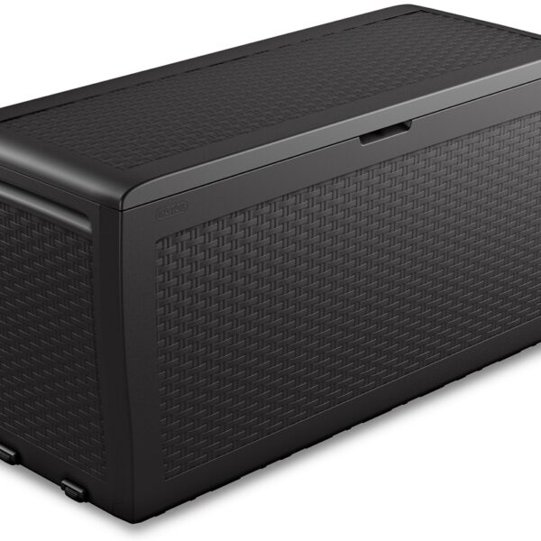 Doskonały schowek na poduszki i akcesoria ogrodowe. Mocna i wytrzymała skrzynia, pięknie zaprojektowana i estetycznie wykończona. Faktura powierzchni przypominają naturalny splot rattanowy. Odporna na szkodliwe warunki atmosferyczne i promieniowanie UV. Nie wymaga konserwacji. Wbudowane uchwyty i rolki ułatwiają przemieszczanie nawet przy wewnętrznym obciążeniu schowka. Łatwy i szybki montaż – bez użycia narzędzi. Produkt bardzo łatwy w utrzymaniu w czystości.