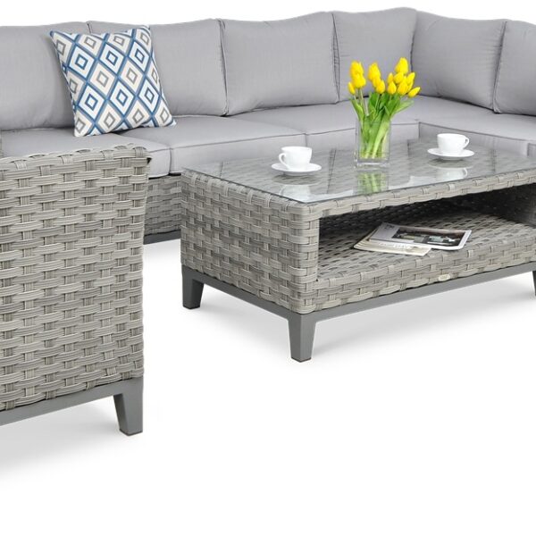 Wyjątkowy komplet, technorattanowy zestaw Malaga Caffe Modern Grey uzupełniony o wygodny, dopasowany kolorystycznie szary fotel, daje mnóstwo ciekawych możliwości. Dwie 3-osobowe kanapy można błyskawicznie połączyć w jeden, duży narożnik, z kolei stolik kawowy posiada praktyczną półeczkę na przydatne przedmioty, a także idealnie równy blat - z grubej tafli hartowanego szkła. Zestaw mebli z technorattanu Malaga Caffe pasuje zarówno do ogrodu, jak również domowej jadalni czy salonu. Plecionka prezentuje się nadzwyczaj atrakcyjnie dla oka, do złudzenia przypomina naturalny materiał. Jednak pod względem pewnych właściwości technorattan ma więcej wspólnego z zaawansowanymi, ekologicznymi tworzywami sztucznymi. Takie rozwiązanie sprawia, że zestaw wypoczynkowy Malaga Caffe Modern Grey wyróżnia się niepowtarzalną stylistyką, a jednocześnie zachowuje gustowne, szare barwy przez wiele kolejnych lat. I to bez konserwacji środkami chemicznymi - pielęgnacja narożnika, stołu oraz fotela ogranicza się do usuwania zabrudzeń wilgotną ścierką lub wodą pod ciśnieniem. Wszystkie elementy zestawu mebli ogrodowych Malaga Caffe wykonane są z doskonałej jakości technorattanu, oplatającego stelaże z aluminium. Dzięki temu gwarantują dużą wytrzymałość i stabilność, obojętnie czy ustawi się je na miękkim trawniku, betonowym tarasie czy parkiecie z drewna. Zestaw Malaga Caffe Modern Grey z narożnikiem, fotelem oraz stolikiem kawowym spodoba się Klientom, którzy wymagają bezkompromisowej jakości i elegancji. Meble ogrodowe z powyższego kompletu fantastycznie sprawdzą się w warunkach domowych, a do tego nadają się na potrzeby lokali HoReCa.
