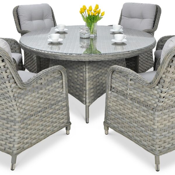Marzysz o przytulnym kąciku do relaksu i ponad wszystko cenisz sobie elegancję i jakość? Zestaw mebli ogrodowych BARCELONA Grey pomoże Ci stworzyć idealną przestrzeń wypoczynkową! Do produkcji mebli wykorzystano lekką i niepodatną na korozję konstrukcję aluminiową (malowaną proszkowo), a także niezwykle odporny na niekorzystne działania atmosferyczne technorattan. Zestaw składa się z 6 wygodnych foteli oraz dużego, okrągłego stołu o średnicy 140 cm pokrytego blatem ze szkła hartowanego o grubości 5 mm. Meble posiadają wygodne poduszki oparciowe i siedziskowe zwiększające komfort użytkowania. Wykorzystane materiały sprawiają, że komplet jest lekki, stabilny i łatwy w utrzymaniu czystości – wystarczy przetrzeć go wilgotną ściereczką, a pokrowce poduszek uprać w pralce. Mieszane faktury technorattanu przypominają naturalny materiał i idealnie komponują się z ogrodową zielenią, natomiast uniwersale połączenie kolorystyczne pozwoli na dopasowanie zestawu do niemal każdej aranżacji. Dzięki zastosowaniu technorattanu i malowanego proszkowo aluminium meble charakteryzują się najwyższą odpornością na działanie niekorzystnych warunków: wiatru, wody, wilgoci, promieniowania UV, zmiennych temperatur. Zestaw nie blaknie, jego powierzchnie nie odkształcają się, co pozwoli na wielosezonowe użytkowanie.