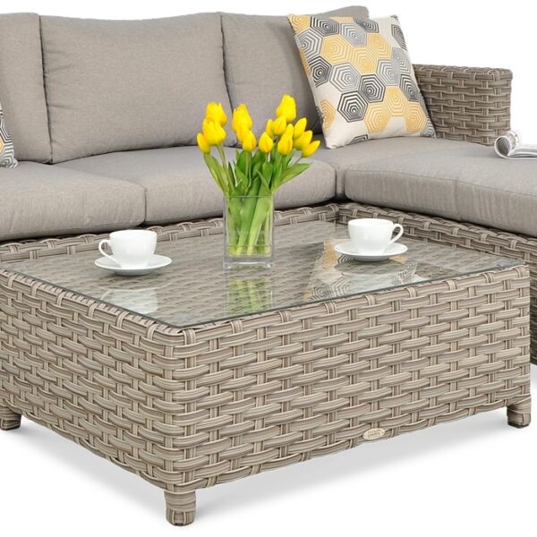 Komplet mebli ogrodowych, które z powodzeniem można ustawić w jadalni albo salonie, zestaw technorattanowy Marco Caffe Beige składa się z 2-częściowego narożnika oraz prostokątnego stolika kawowego, zwieńczony blatem z hartowanego szkła. Prezentowane meble ogrodowe z łatwością dostosujesz do dowolnych okoliczności. Nowoczesny narożnik Marco Caffe z technorattanu to połączenie 3-osobowej sofy z szeroką pufą: utworzą zgrabną całość lub ustawisz je osobno, w zależności od potrzeb. Każda część utrzymana jest w beżowej kolorystyce, a barwa poduch na siedziska i oparcie świetnie komponuje się z pozostałymi elementami zestawu. Narożnik Marco Caffe powstaje z technorattanu, wszystkie części w zestawie mebli ogrodowych wyplatane są na stelażu ze stali. Wytrzymałe, odporne tworzywa sprawiają, że cały komplet staje się banalnie prosty w utrzymaniu, możesz wystawiać meble na zewnątrz, możesz korzystać z nich na co dzień w domu: narożnik technorattanowy Marco Caffe Beige będzie doskonałym wyborem na każdą okazję. Obojętnie, czy szukasz czegoś na specjalne okazje, czy też mebli do salonu, na rodzinne wieczory. Sofa i pufa z zestawu technorattanowego Marco Caffe utworzą zarówno lewy, jak i prawy narożnik. Jeśli lubisz często zmieniać aranżacje, a jednocześnie oczekujesz najwyższej jakości oraz nowoczesnej stylistyki, ten unikatowy komplet mebli ogrodowych jest dokładnie tym, czego szukasz!