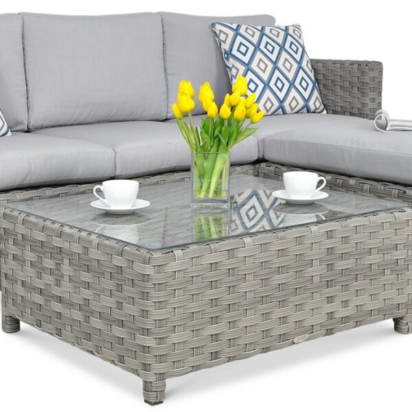 Komplet mebli ogrodowych, które z powodzeniem można ustawić w jadalni albo salonie, zestaw technorattanowy Marco Caffe Modern Grey składa się z 2-częściowego narożnika oraz prostokątnego stolika kawowego, zwieńczony blatem z hartowanego szkła. Prezentowane meble ogrodowe z łatwością dostosujesz do dowolnych okoliczności. Nowoczesny narożnik Marco Caffe z technorattanu to połączenie 3-osobowej sofy z szeroką pufą: utworzą zgrabną całość lub ustawisz je osobno, w zależności od potrzeb. Każda część utrzymana jest w szarej kolorystyce, a barwa poduch na siedziska i oparcie świetnie komponuje się z pozostałymi elementami zestawu. Narożnik Marco Caffe powstaje z technorattanu, wszystkie części w zestawie mebli ogrodowych wyplatane są na stelażu ze stali. Wytrzymałe, odporne tworzywa sprawiają, że cały komplet staje się banalnie prosty w utrzymaniu, możesz wystawiać meble na zewnątrz, możesz korzystać z nich na co dzień w domu: narożnik technorattanowy Marco Caffe Modern Grey będzie doskonałym wyborem na każdą okazję. Obojętnie, czy szukasz czegoś na specjalne okazje, czy też mebli do salonu, na rodzinne wieczory. Sofa i pufa z zestawu technorattanowego Marco Caffe utworzą zarówno lewy, jak i prawy narożnik. Jeśli lubisz często zmieniać aranżacje, a jednocześnie oczekujesz najwyższej jakości oraz nowoczesnej stylistyki, ten unikatowy komplet mebli ogrodowych jest dokładnie tym, czego szukasz!