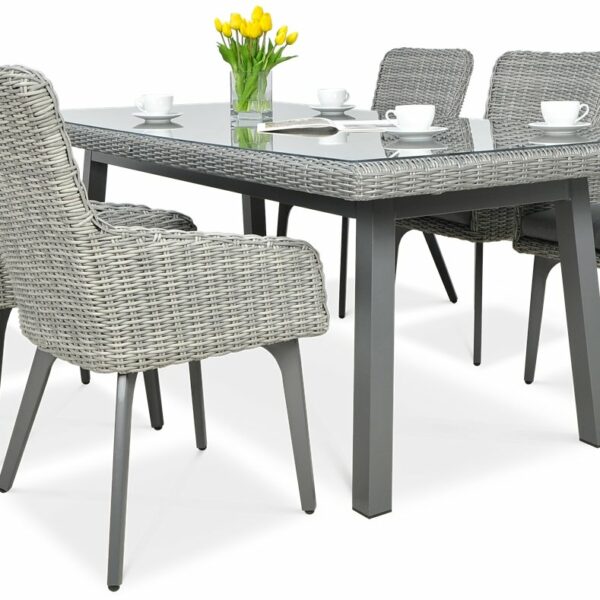 Składający się z 7 elementów zestaw jadalniany Milano 6/200 Stone Grey nadaje się zarówno do reprezentacyjnego salonu, jak i na przyjęcie pod chmurką w przydomowym ogrodzie. Oryginalna, nawiązująca do popularnego stylu skandynawskiego estetyka mebli idzie w parze z praktycznymi zaletami. Zarówno 6 komfortowych krzeseł, jak i duży prostokątny stół z zestawu Milano 6/200 posiadają mocne stelaże z aluminium oraz technorattanową plecionkę, efekt wizualny najlepiej oddają powyższe zdjęcia. A co do właściwości mebli ogrodowych, zestaw technorattanowy Milano Stone Grey 6/200 na pewno wyróżnia się swoją długowiecznością, materiał powlekający krzesła oraz stół wygląda naturalnie, a do tego zapewnia odporność przed zniszczeniem przez promieniowanie UV czy opady atmosferyczne. I to wszystko bez smarowania ich jakimikolwiek impregnatami! Kupując szary zestaw mebli jadalnianych Milano 6/200 można spokojnie założyć, że będzie można z niego swobodnie korzystać bez najmniejszego uszczerbku, przez długi czas. Jeśli szukasz wyposażenia do jadalni, salonu lub mebli ogrodowych, ta propozycja z katalogu Focus Garden przypadnie Ci do gustu! Krzesła, ze względu na swój profil, szerokie oparcia, spokojnie mogą zastąpić salonowe fotele, tym bardziej że w zestawie Milano 6/200 znajdują się również dopasowane do szarej kolorystyki poduchy siedziskowe, a wysokie nogi wszystkich mebli ogrodowych z kompletu mają specjalne, imitujące ręczne malowanie wykończenia. Dzięki temu zestaw mebli technorattanowych Milano Stone Grey 6/200 prezentuje się efektownie, co czyni z niego doskonały wybór dla wszystkich miłośników prawdziwej elegancji.