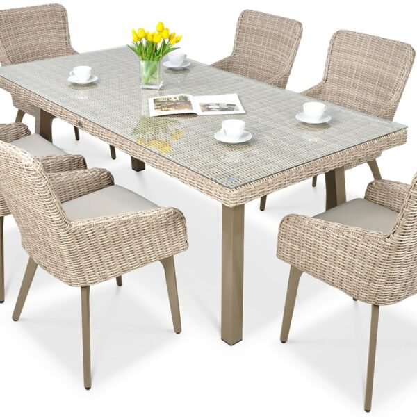 Składający się z 7 elementów zestaw jadalniany Milano 6/200 Light Beige nadaje się zarówno do reprezentacyjnego salonu, jak i na przyjęcie pod chmurką w przydomowym ogrodzie. Oryginalna, nawiązująca do popularnego stylu skandynawskiego estetyka mebli idzie w parze z praktycznymi zaletami. Zarówno 6 komfortowych krzeseł, jak i duży prostokątny stół z zestawu Milano 6/200 posiadają mocne stelaże z aluminium oraz technorattanową plecionkę, efekt wizualny najlepiej oddają powyższe zdjęcia. A co do właściwości mebli ogrodowych, zestaw technorattanowy Milano Light Beige 6/200 na pewno wyróżnia się swoją długowiecznością, materiał powlekający krzesła oraz stół wygląda naturalnie, a do tego zapewnia odporność przed zniszczeniem przez promieniowanie UV czy opady atmosferyczne. I to wszystko bez smarowania ich jakimikolwiek impregnatami! Kupując jasnobeżowy zestaw mebli jadalnianych Milano 6/200 można spokojnie założyć, że będzie można z niego swobodnie korzystać bez najmniejszego uszczerbku, przez długi czas. Jeśli szukasz wyposażenia do jadalni, salonu lub mebli ogrodowych, ta propozycja z katalogu Focus Garden przypadnie Ci do gustu! Krzesła, ze względu na swój profil, szerokie oparcia, spokojnie mogą zastąpić salonowe fotele, tym bardziej że w zestawie Milano 6/200 znajdują się również dopasowane do jasnobeżowej kolorystyki poduchy siedziskowe, a wysokie nogi wszystkich mebli ogrodowych z kompletu mają specjalne, imitujące ręczne malowanie wykończenia. Dzięki temu zestaw mebli technorattanowych Milano Light Beige 6/200 prezentuje się efektownie, co czyni z niego doskonały wybór dla wszystkich miłośników prawdziwej elegancji.