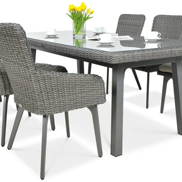Składający się z 7 elementów zestaw jadalniany Milano 6/200 Dark Grey nadaje się zarówno do reprezentacyjnego salonu, jak i na przyjęcie pod chmurką w przydomowym ogrodzie. Oryginalna, nawiązująca do popularnego stylu skandynawskiego estetyka mebli idzie w parze z praktycznymi zaletami. Zarówno 6 komfortowych krzeseł, jak i duży prostokątny stół z zestawu Milano 6/200 posiadają mocne stelaże z aluminium oraz technorattanową plecionkę, efekt wizualny najlepiej oddają powyższe zdjęcia. A co do właściwości mebli ogrodowych, zestaw technorattanowy Milano Dark Grey 6/200 na pewno wyróżnia się swoją długowiecznością, materiał powlekający krzesła oraz stół wygląda naturalnie, a do tego zapewnia odporność przed zniszczeniem przez promieniowanie UV czy opady atmosferyczne. I to wszystko bez smarowania ich jakimikolwiek impregnatami! Kupując ciemnoszary zestaw mebli jadalnianych Milano 6/200 można spokojnie założyć, że będzie można z niego swobodnie korzystać bez najmniejszego uszczerbku, przez długi czas. Jeśli szukasz wyposażenia do jadalni, salonu lub mebli ogrodowych, ta propozycja z katalogu Focus Garden przypadnie Ci do gustu! Krzesła, ze względu na swój profil, szerokie oparcia, spokojnie mogą zastąpić salonowe fotele, tym bardziej że w zestawie Milano 6/200 znajdują się również dopasowane do ciemnoszarej kolorystyki poduchy siedziskowe, a wysokie nogi wszystkich mebli ogrodowych z kompletu mają specjalne, imitujące ręczne malowanie wykończenia. Dzięki temu zestaw mebli technorattanowych Milano Dark Grey 6/200 prezentuje się efektownie, co czyni z niego doskonały wybór dla wszystkich miłośników prawdziwej elegancji.