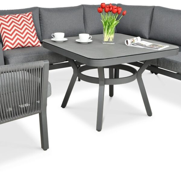 Komplet nowoczesnych mebli do użytku zewnętrznego i wewnętrznego, reprezentujących najnowsze trendy. Zestaw, który tworzą dwuczęściowy narożnik Salvador Dining, wygodny fotel oraz efektowny stół, będzie prawdziwą ozdobą Twojego domu oraz ogrodu - a zarazem niezwykle praktycznym wyposażeniem. Dwie sofy, dwu- i trzyosobową, można łatwo połączyć w jedną, wygodną całość. Konstrukcja to aluminium malowane proszkowo w szare barwy a przestrzeń pomiędzy oparciami i podłokietnikami wypełniają napięte, nylonowe sznury, które nadają temu narożnikowi jedynego w swoim rodzaju nowoczesnego i futurystycznego designu. Wygląda to niezwykle interesująco, co ważne świetnie sprawdza się podczas codziennego użytkowania mebli ogrodowych. Narożnik Salvador Dining zachwyca tak samo odważnym designem, jak również charakterystyką, zastosowanie najlepszych materiałów sprawia, że wszystkie elementy kompletu są trwałe i odporne na wszelkie uszkodzenia. Warto przy tym zwrócić uwagę na solidny blat stołu pomalowany na imitacje naturalnego kamienia (tzw. stone spray glass). Narożnik oraz pozostałe meble z zestawu Salvador Dining są wytrzymałe, a przy tym lekkie i łatwe do przeniesienia w inne miejsce. Do kompletu z narożnikiem ogrodowym Salvador Dining należą jeszcze grube, miękkie zapewniające maksymalny komfort poduchy z rozpinanymi, utrzymanymi w tej samej, szarej kolorystyce poszewkami.