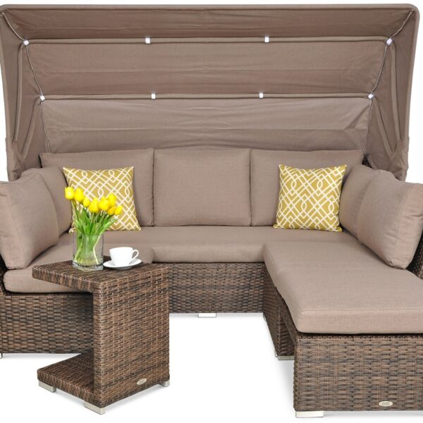 - całość wykończona jest plecionką technorattanową w odcieniu brązowym, całkowicie odporną na wodę, promieniowanie UV i temperatury
