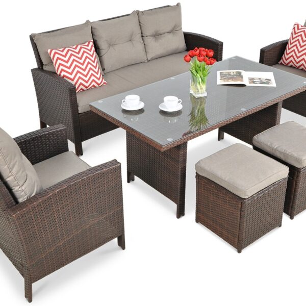 - zestaw mebli ogrodowych składający się z aż 6 elementów – sofa, stół, 2x fotel, 2x puf