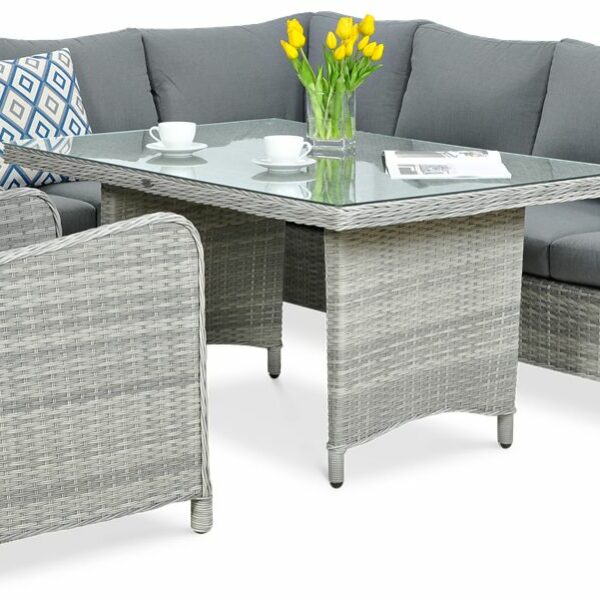 Stylowy i wielofunkcyjny komplet mebli ogrodowych z technorattanu. Zestaw wypoczynkowy z narożnikiem Maryland Stone Grey składa się z 2 modułów głównych, 2 foteli oraz dużego stołu. Liczba możliwych ustawień i konfiguracji pozwala błyskawicznie dostosować meble do potrzeby konkretnej chwili. Poziom wykonania wszystkich elementów, utrzymanych w szarej kolorystyce, stoi na najwyższym poziomie. Narożnik technorattanowy Maryland może być zarówno jednym meblem, jak i też dwoma niezależnymi, 3-osobowymi sofami. W każdym wariancie, bez względu na okoliczności, użytkownik ma poczucie pełnego komfortu, do zestawu dołączone są poduchy na siedziska oraz oparcia, jeszcze bardziej poprawiające wygodę. Technorattanowa plecionka w odcieniach szarości prezentuje się nadzwyczaj elegancko, identycznie jak naturalny materiał, jednak pod względem wytrzymałości meble z kompletu należą do zupełnie innej, wyższej ligi. Materiał wykazuje się odpornością na promieniowanie UV czy opady atmosferyczne. Meble ogrodowe z technorattanu są banalnie proste i mało wymagające w pielęgnacji. Cały zestaw wypoczynkowych mebli ogrodowych, w którym znajduje się narożnik Maryland Stone Grey z technorattanu, stanowi idealną propozycję dla osób oczekujących estetyki, wygody trwałości oraz szerokiej gamy możliwych zastosowań.