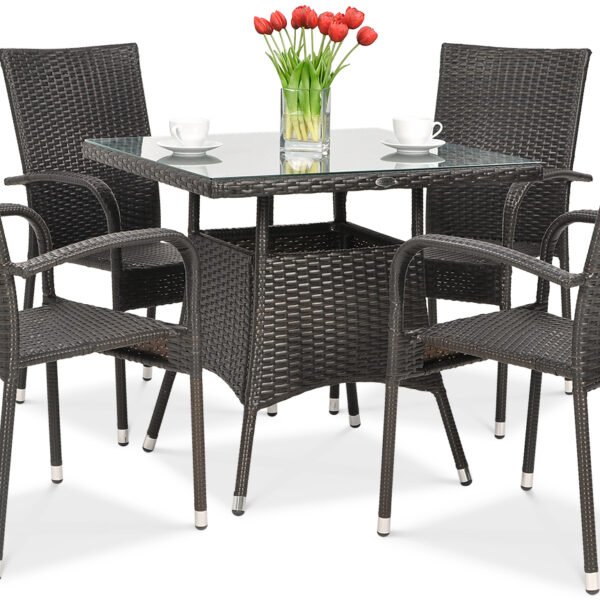 - w skład kompletu wchodzą 4 wygodne krzesła oraz funkcjonalny, kwadratowy stół